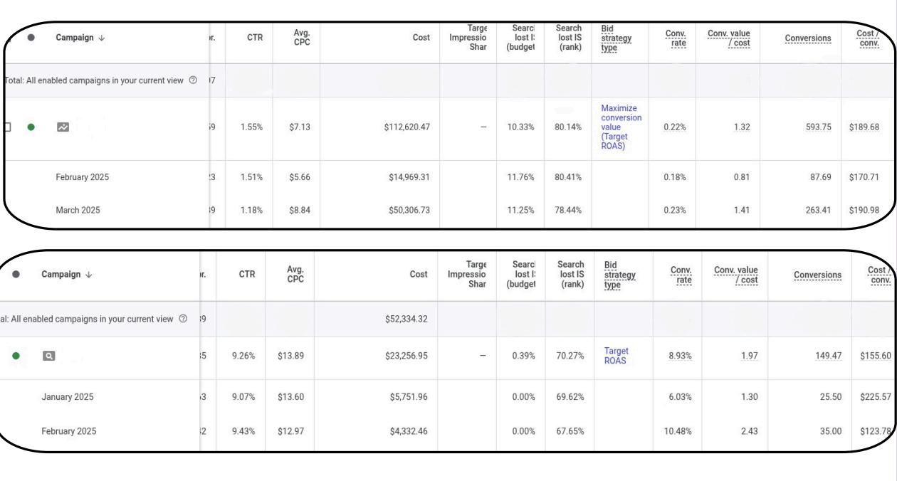 - Performance Max ran with generic imagery and copy, light on trust signals and proof for a higher ticket decision