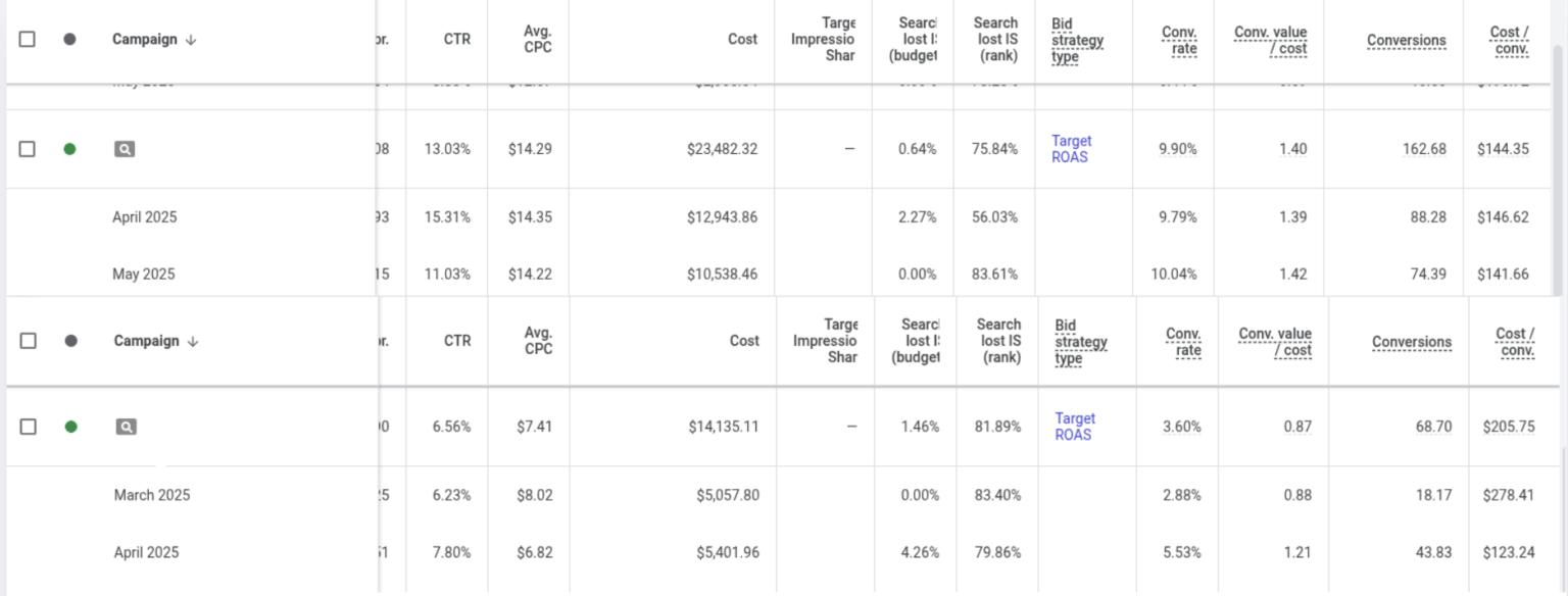 - Search campaigns saw CTR climb into the 11–15% range on key service segments, with April CTR reaching 11.85% on the main search campaign